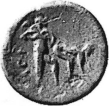 head of Neptune, right, bound with taenia; trident behind neck