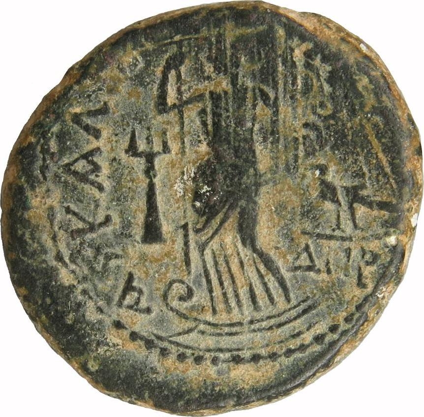 Tyche standing, left, on prow with standard and aphlaston; in left field incense altar; in right field dove standing left