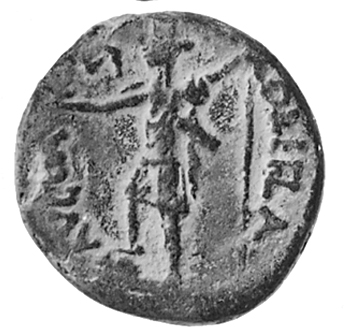 city-goddess standing, left, with right foot on prow, resting left hand on cross-headed standard, holding in right hand a human bust