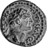 Zeus naked standing, left, drapery hanging on his left arm, holding a long sceptre in his right hand |