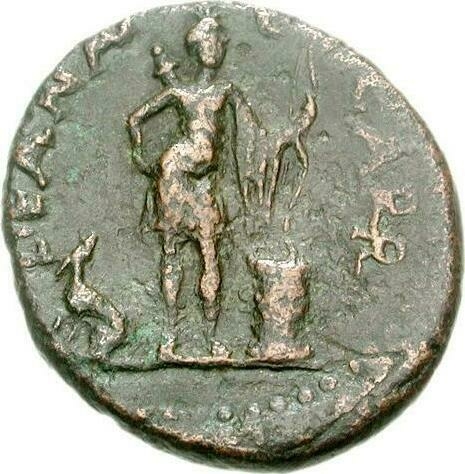 Artemis Laphria facing, wearing short chiton and chlamys, holding bow in left hand over altar; on left side, dog looking up