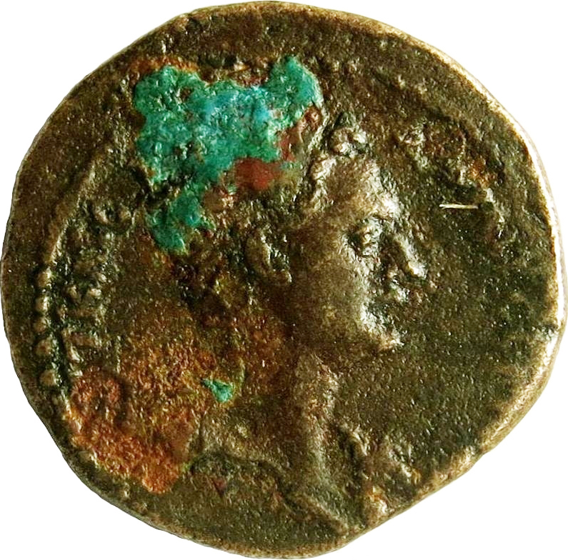 head of Domitian wreathed with corn, right with drapery and aegis on left shoulder