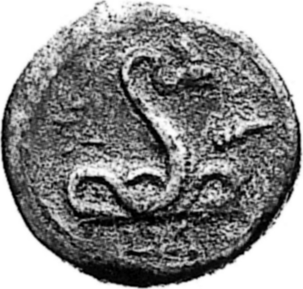 agathadaemon serpent erect, right, with corn-ears and caduceus