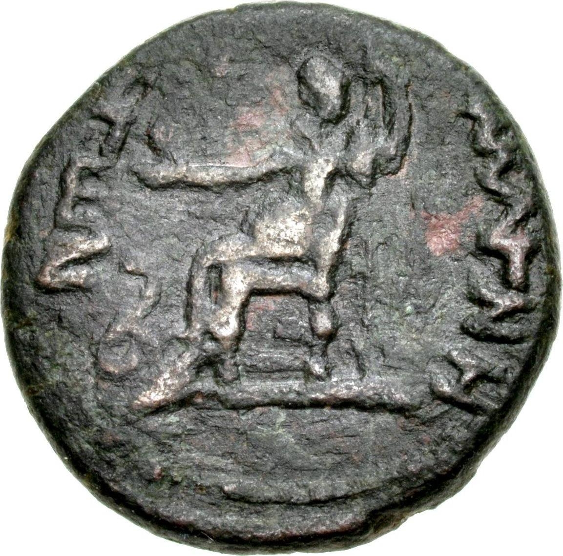 Asclepius (?) seated left, his left arm resting on sceptre, his right hand towards a serpent in front of him