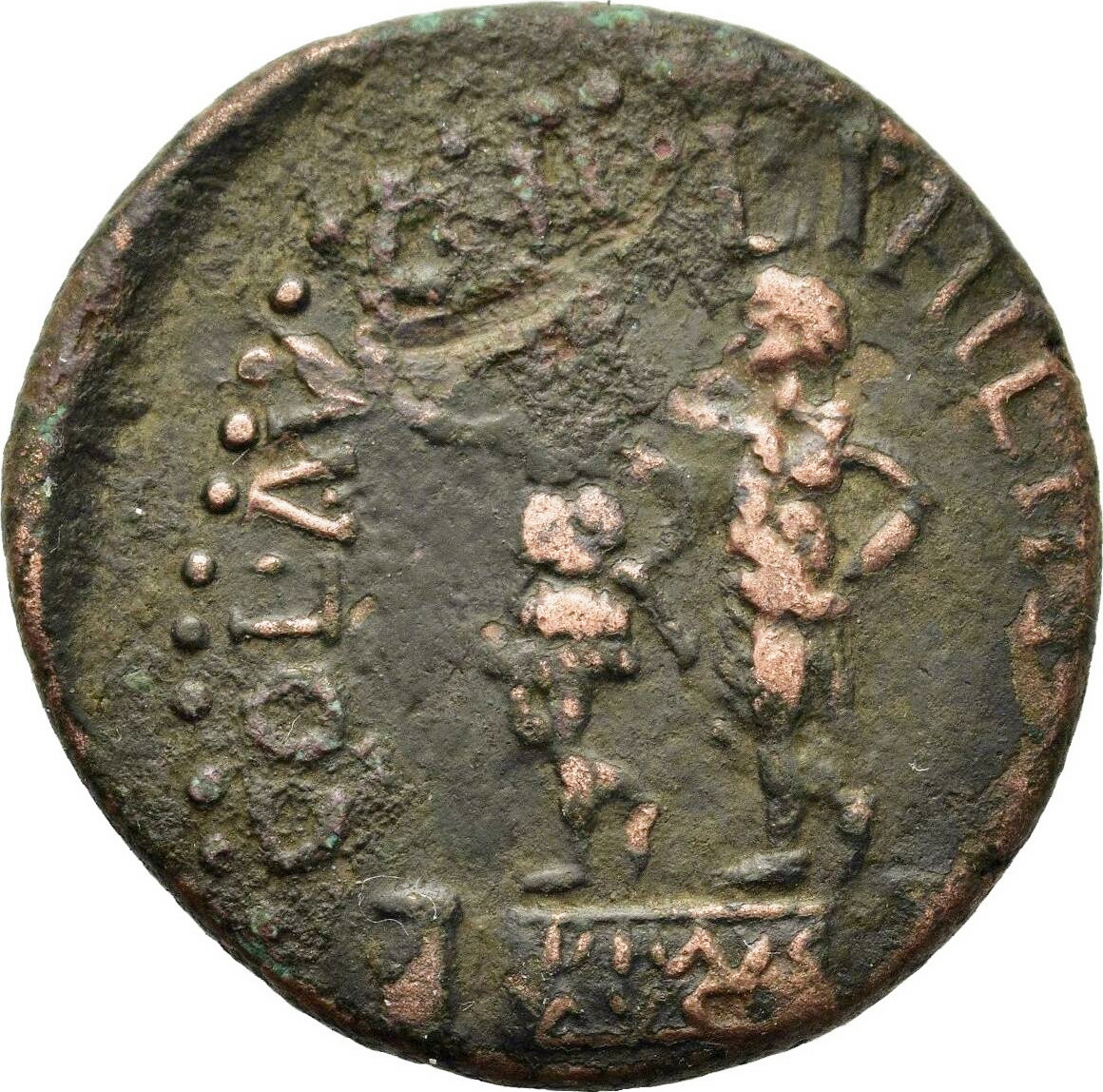 three bases; on middle one, statue of Augustus in military dress crowned by statue of Divus Julius wearing toga