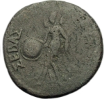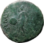 Nike advancing left, holding shield and wreath