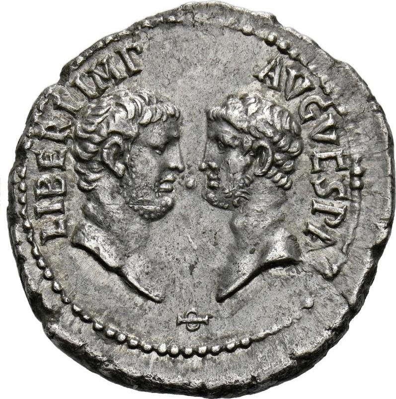 confronted bare heads of Titus and Domitian; below, Φ