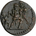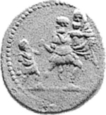 Aeneas walking right, leading Ascanius and carrying Anchises