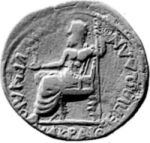 Zeus seated, left, holding Nike and sceptre