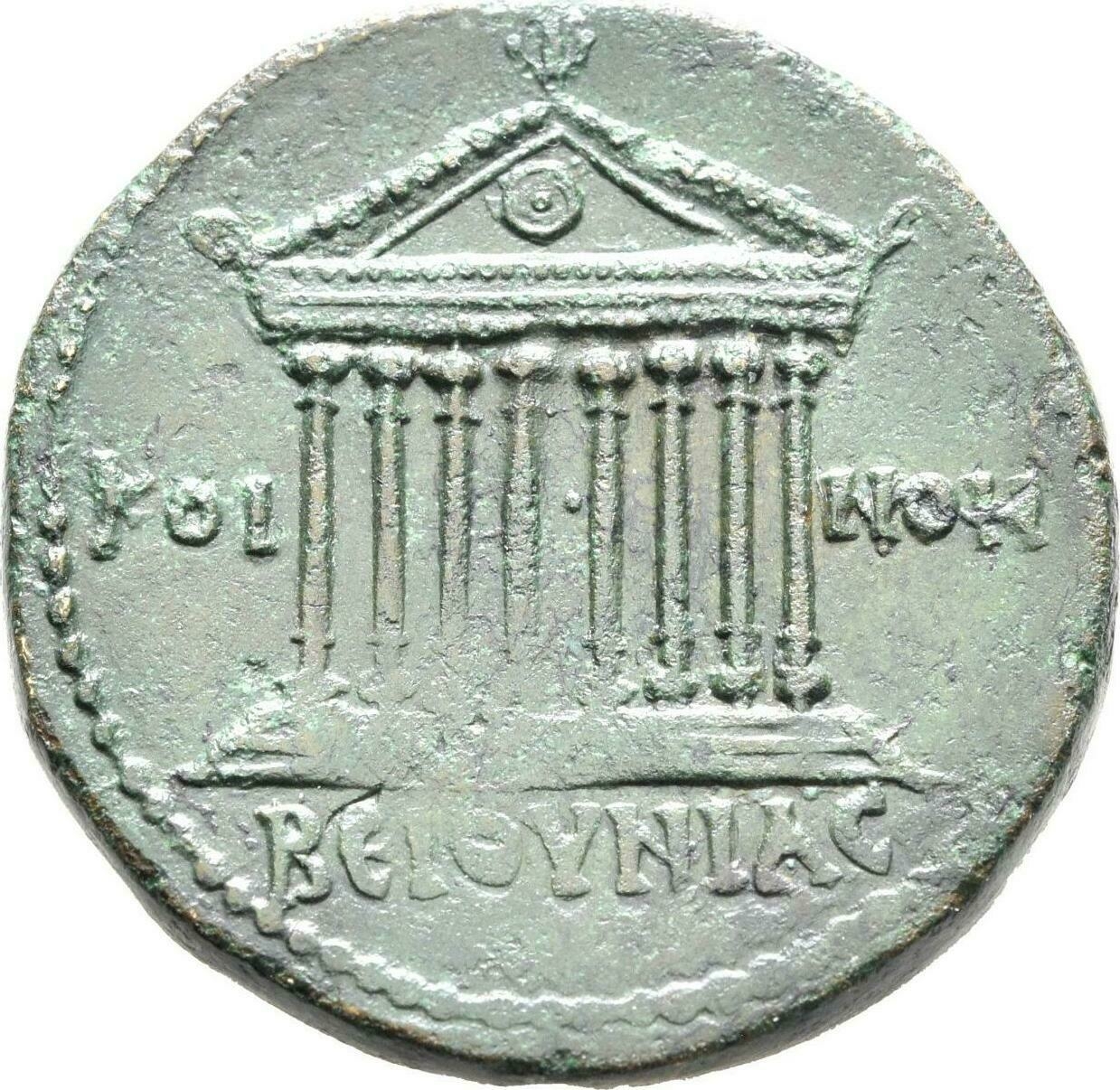 temple with eight columns on podium of two steps; in pediment, clipeus