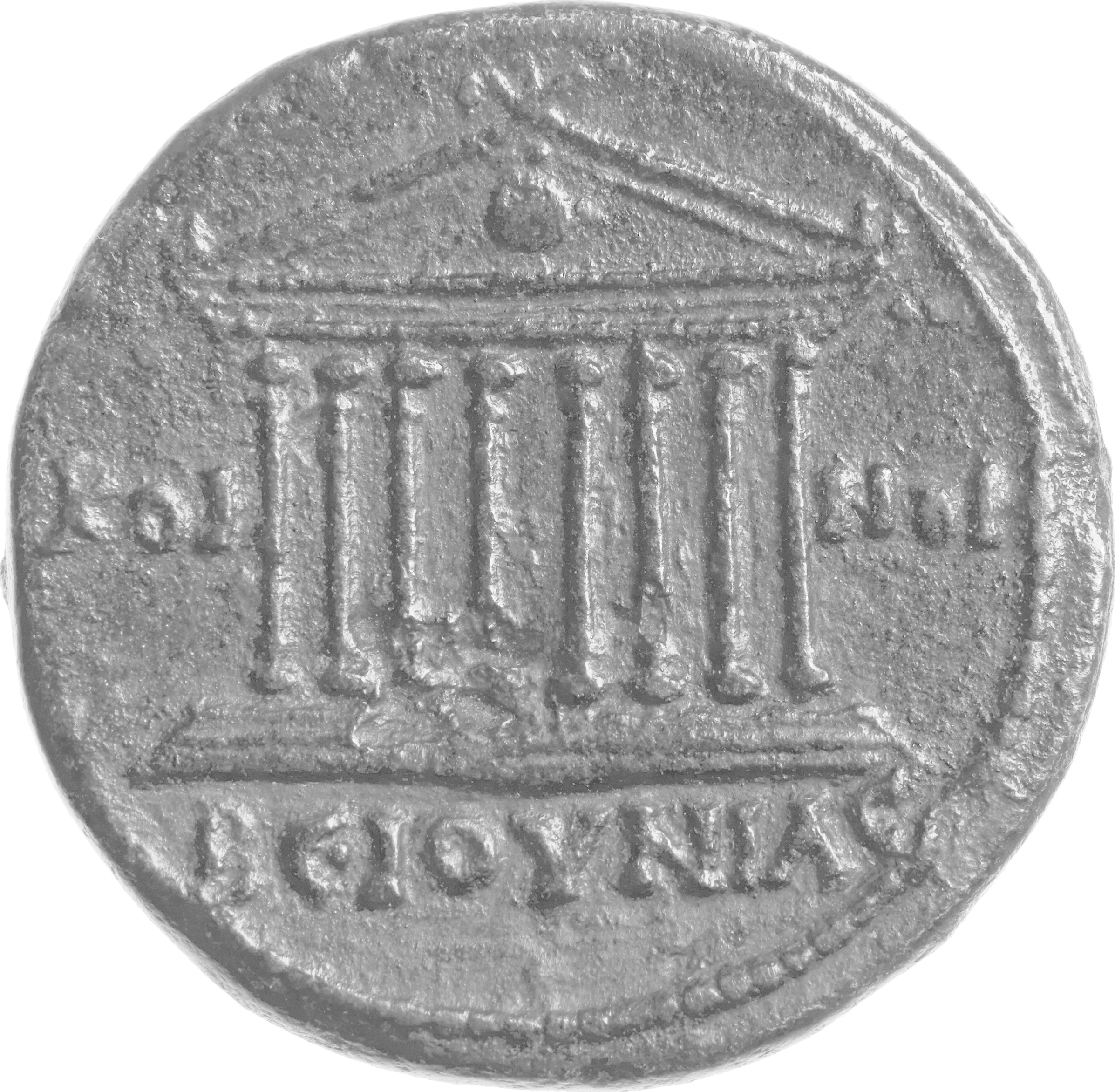 temple with eight columns on podium of two steps; in pediment, clipeus