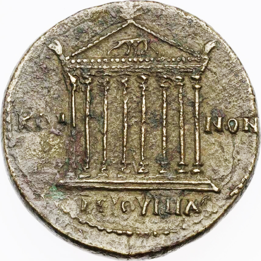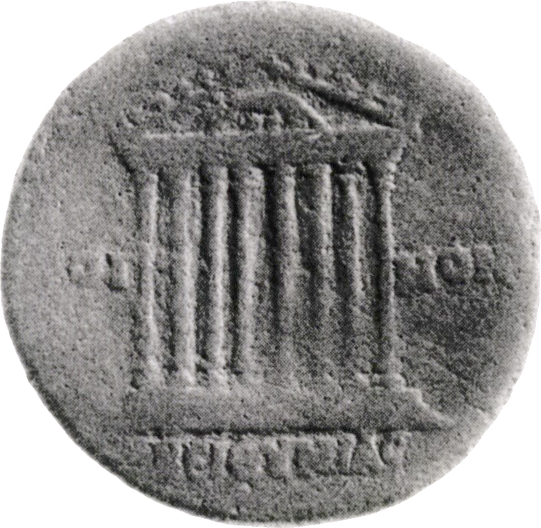 temple with eight columns on podium of two steps; in pediment, wolf and twins