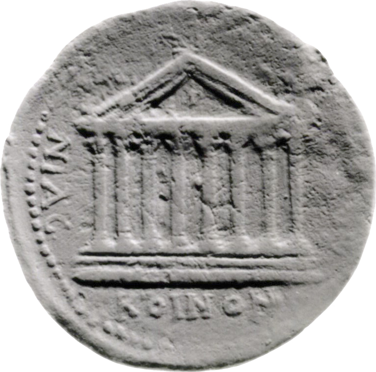 temple with eight columns on podium of two steps; pellet between middle columns; in pediment, sacrificing Genius between pellets; Nikai on apex and cornices