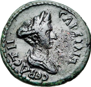 draped bust of Sabina, right, with hair coiled and piled on top of head above double stephane