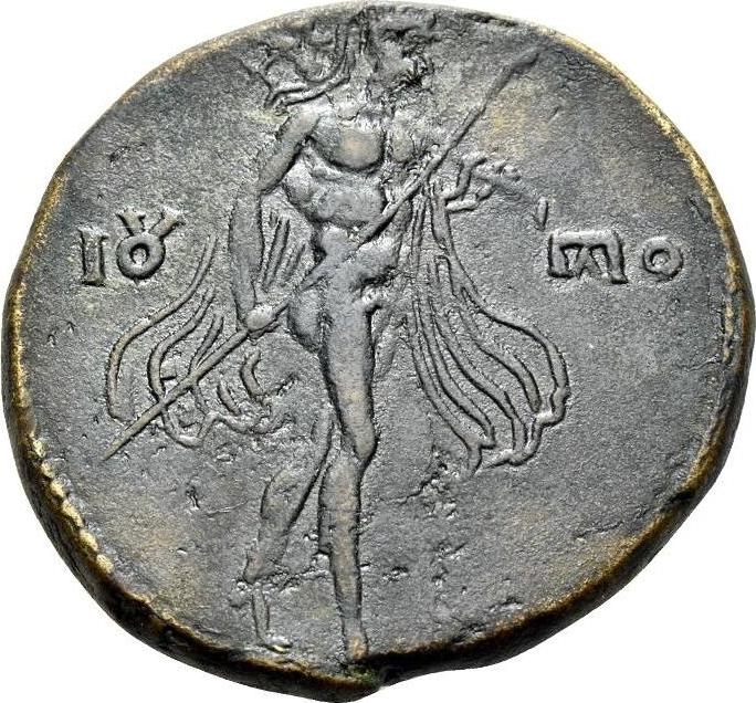 Ares walking right, holding spear in right hand and trophy on left shoulder