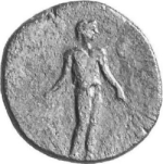 Isthmus personified as a young male figure, naked, standing facing, head right, holding a rudder in each hand