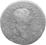 laureate head of Trajan, right, with drapery on left shoulder (?)