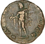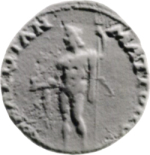 Poseidon standing left, holding dolphin on his extended right hand, left resting on trident