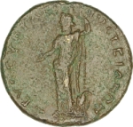 Zeus Syrgastes wearing chiton and himation standing left, holding patera in right hand, left resting on sceptre; at his feet, right, eagle right