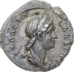diademed and draped bust of Sabina, right, hair falling in plait down neck