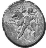 Bellerophon naked with a chlamys on his left shoulder standing left, seizing Pegasus by bridle with right hand, holding spear in left and shield on left shoulder