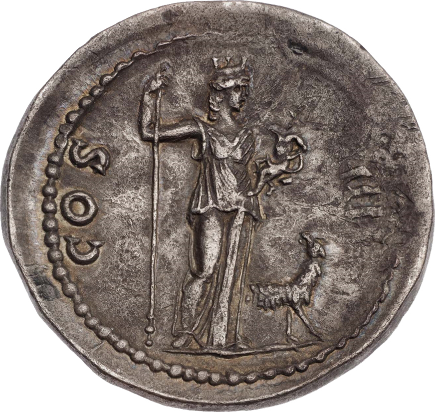 Amaltheia standing right holding infant Jupiter in right and vertical staff in left; at her feet, goat looking back
