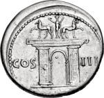 triumphal arch surmounted by figure raising hand and holding sceptre flanked by two prancing horses
