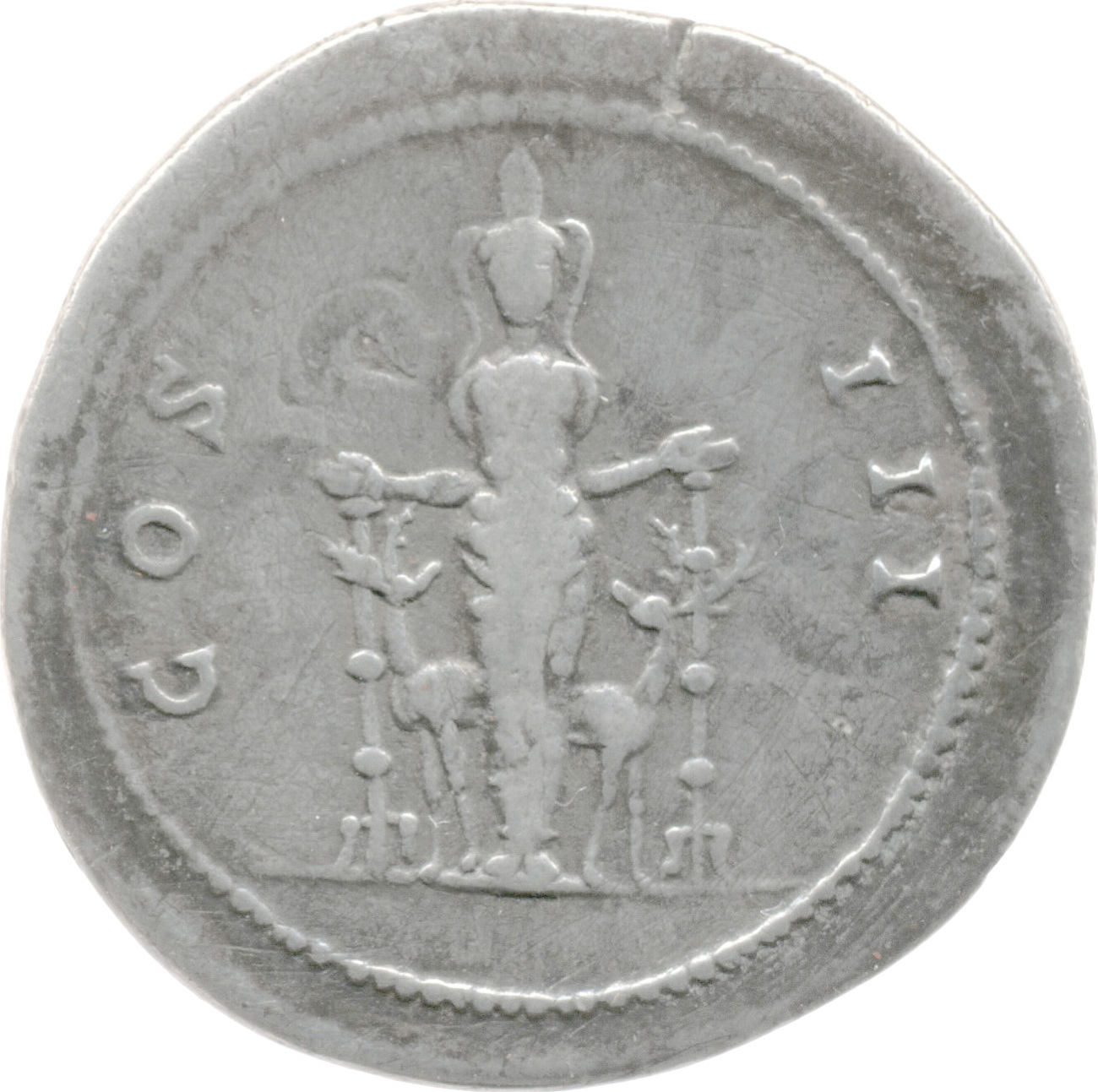 cult image of Ephesian Artemis facing front, arms extended left and right over stags who look back at her; fillets fall to ground, ending in trident shape