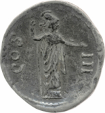 Athena standing right holding thunderbolt in left and spear in upraised right