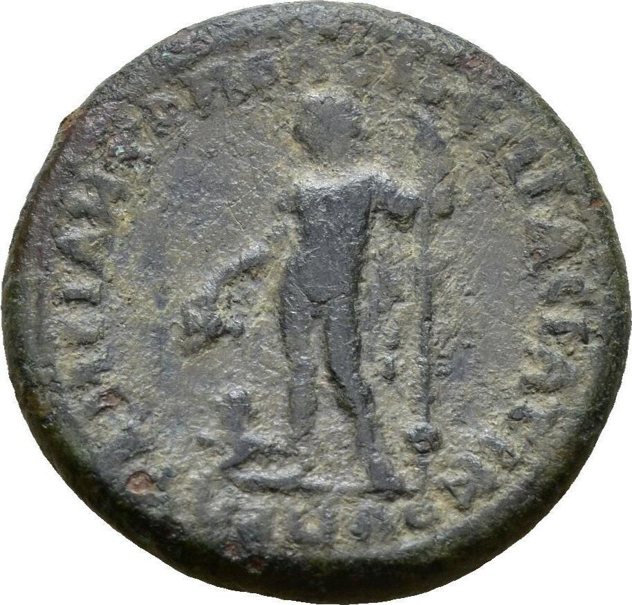 Dionysus standing left, chlamys over shoulder, holding cantharus in right hand, resting with left on thyrsus; at his feet, left panther, head upraised
