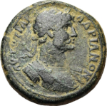 Dionysus standing left, chlamys over shoulder, holding cantharus in right hand, resting with left on thyrsus; at his feet, left panther, head upraised