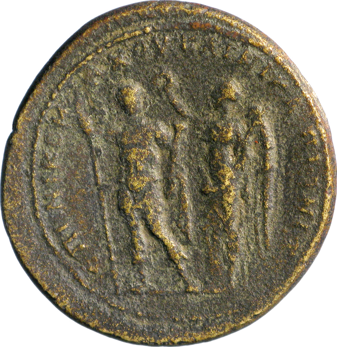 on left, emperor in miltary dress standing facing, resting with his right hand on spear, holding sword and palm in his left hand, crowned by Nike holding wreath in her right hand and palm in left |