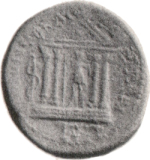 temple with four columns of Augustus within which emperor standing facing, resting on spear with his right hand; in left field, serpent-staff; in exergue, monogram