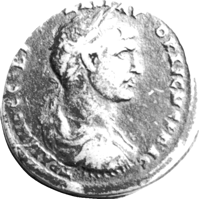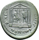 temple with four columns of Zeus Philios on podium with three steps within which Zeus Philios seated right, holding patera in his right hand, his left resting on sceptre and Trajan standing facing, his head turned left, in military dress, his left resting on spear |