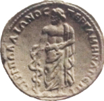 Asclepius standing facing, head left, resting with his right hand on serpent-staff