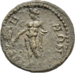 Apollo naked standing facing, head left, holding laurel-branch in right hand, a mantle on his left arm