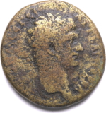 Apollo Tyrimnaios naked standing facing, head left, holding a laurel-branch in his extended right hand, a double axe in his left from which hangs chlamys |