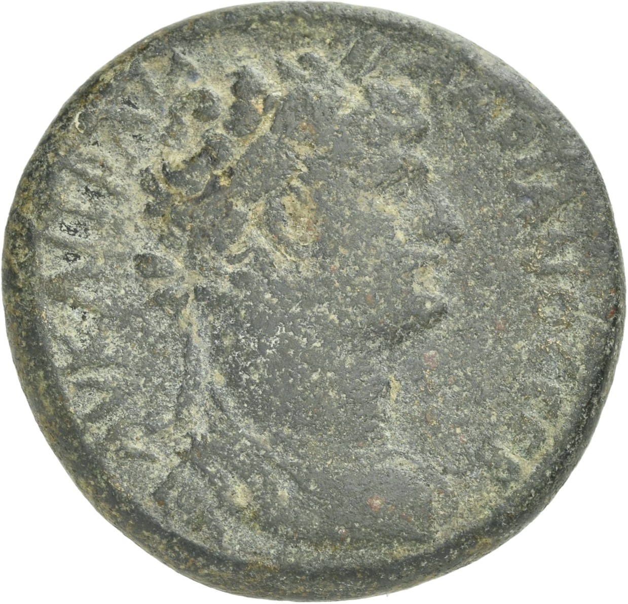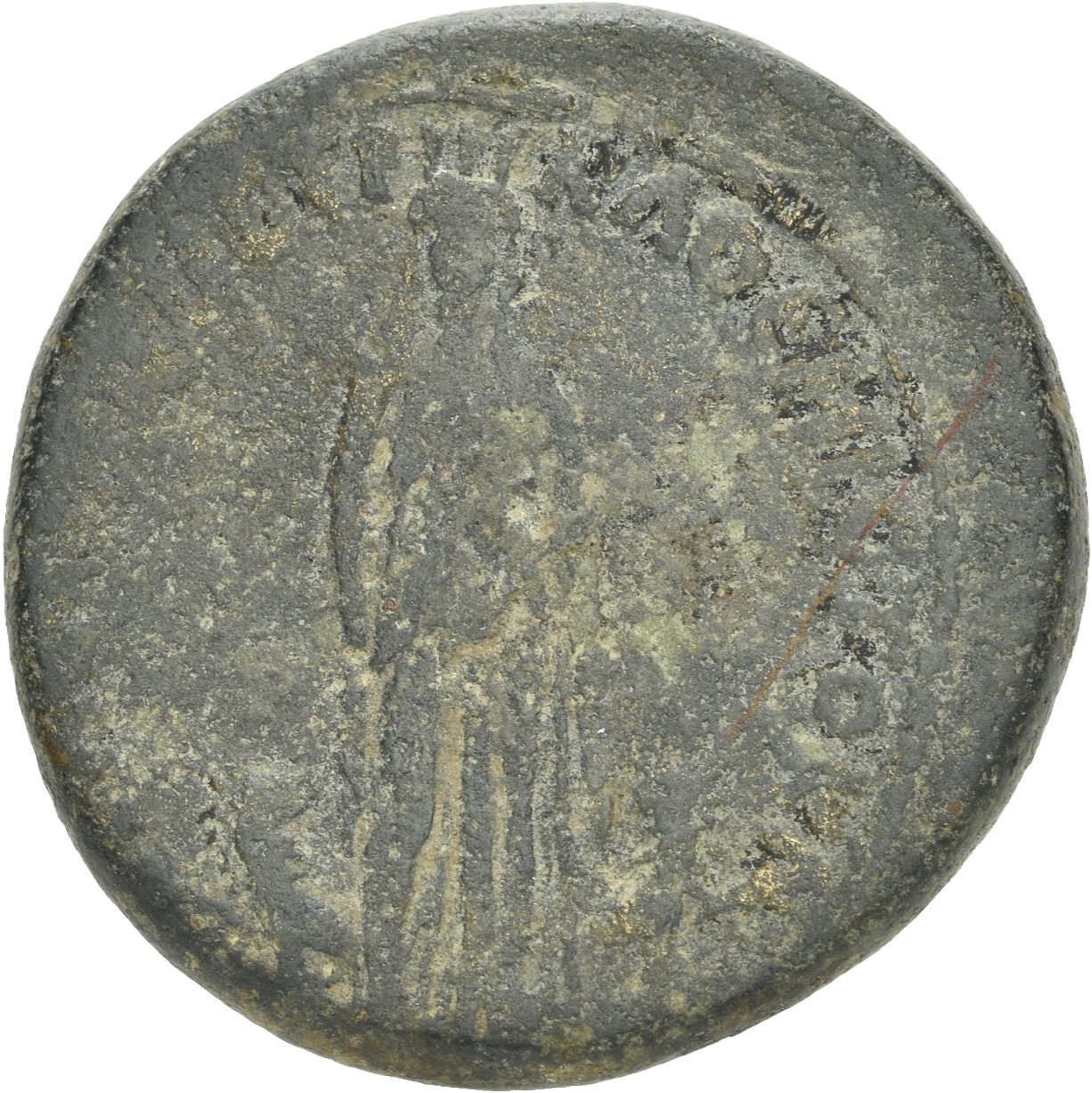 Cybele turreted and veiled standing facing, head left, between two lions seated with raised forepaw |