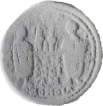 Demos of Magnesia standing left, looking right, holding cult statue of Artemis Leukophryene, facing Demos of Ephesus, standing right, looking left, holding cult statue of Artemis Ephesia