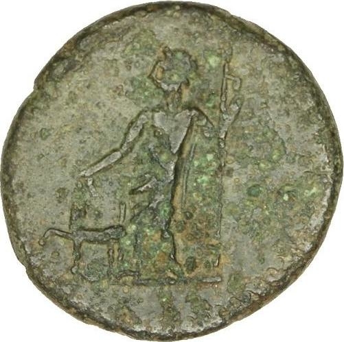 Dionysus standing left, holding cantharus in right hand, left resting on thyrsus; at his feet, left, panther
