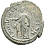 Artemis in long chiton standing, left, holding patera in extended right hand and arrow and bow in left; at her feet, stag left, looking right