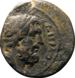 Zeus (?) seated left, his right arm extended