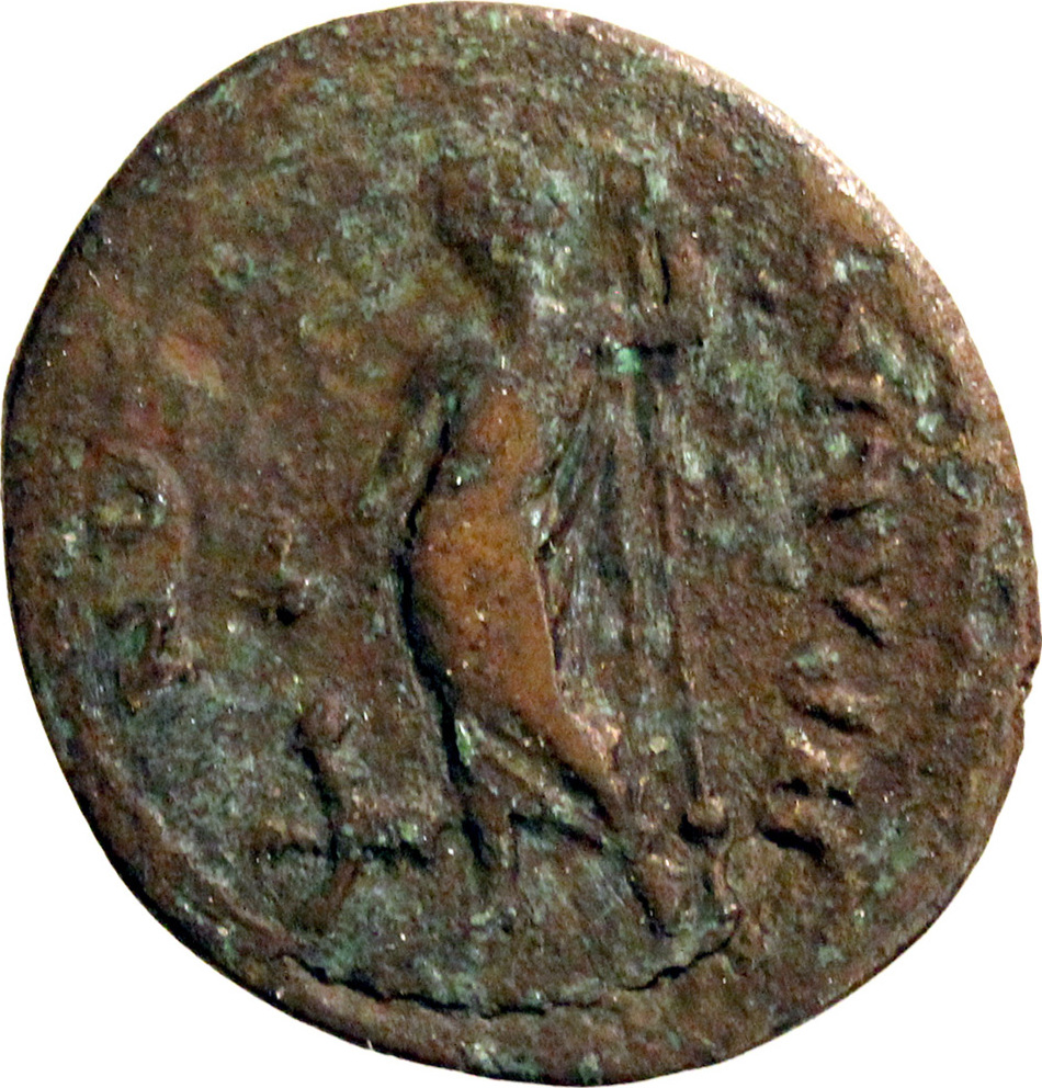 Dionysus standing left holding cantharus in right hand, thyrsus in left; panther behind