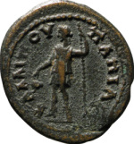 Dionysus standing left holding bunch of grapes and resting on thyrsus