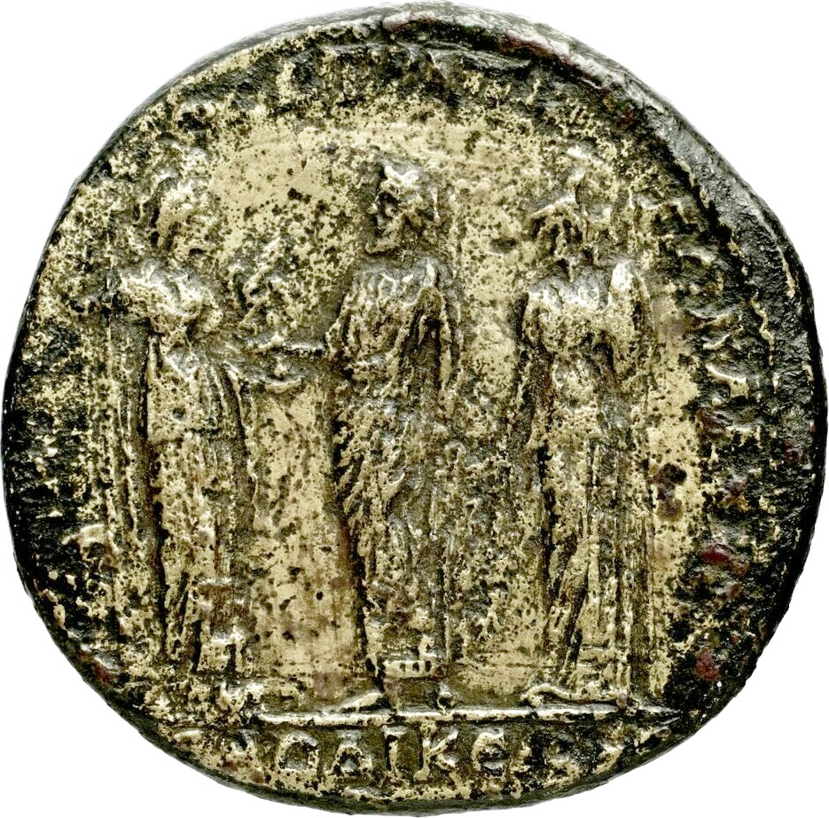 Zeus Laodiceus standing facing, head left, holding eagle in his extended right hand, left resting on sceptre; on left, Hera wearing kalathos, standing right, resting on sceptre with her right hand; on right, Athena standing left, with peplos and helmet, holding olive branch in her lowered right hand, spear and shield in left |