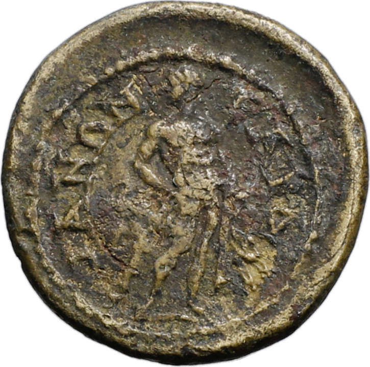 Heracles standing facing, head left, resting on club with his right hand, holding lion skin in left