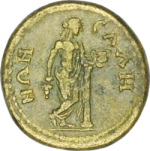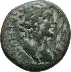 Dionysus naked to waist, himation over lower limbs, standing cross-legged right, holding a bunch of grapes in right hand and a cantharus in his left hand leaning on a column