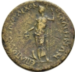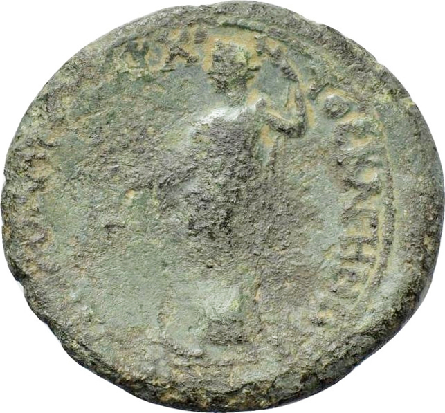 Dionysus standing left, holding cantharus in his right hand, resting with left on thyrsus; at his feet, panther |