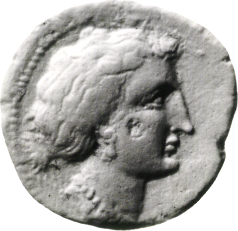 Ηead of Aphrodite (?), with earring and necklace, right, hair brought back and tied behind, leaving loose ends