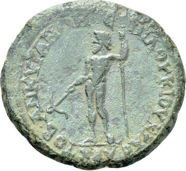 Zeus naked standing facing, head left, holding anchor in his right hand, left resting on sceptre |